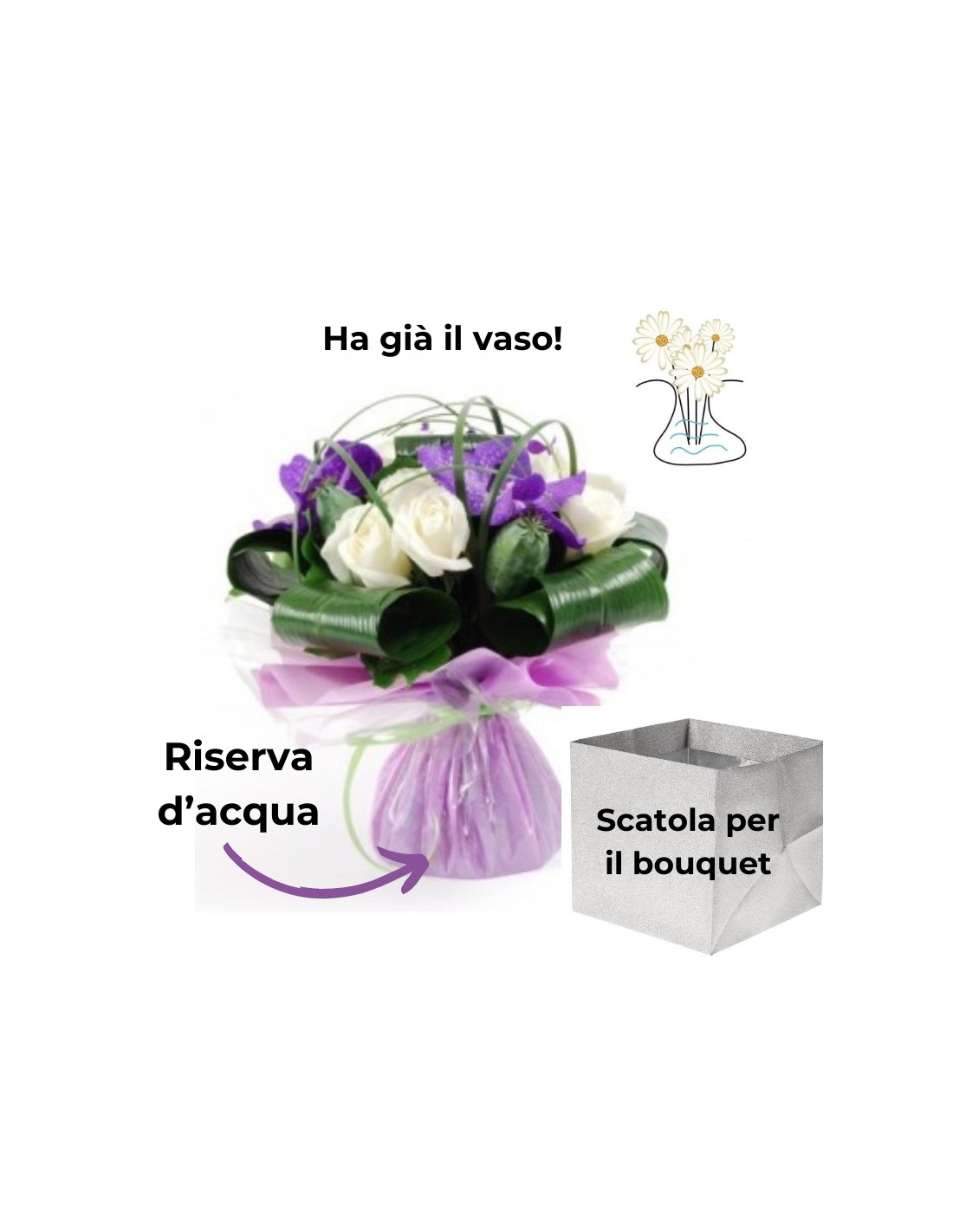Florist's advice for long life: as soon as you receive your beautiful gift, place this bouquet including already vase in a place away from heat sources and drafts to avoid temperature changes and remember not to keep the flowers in the sun. Do not open the package because it already contains all the water sufficient for the duration of the bouquet