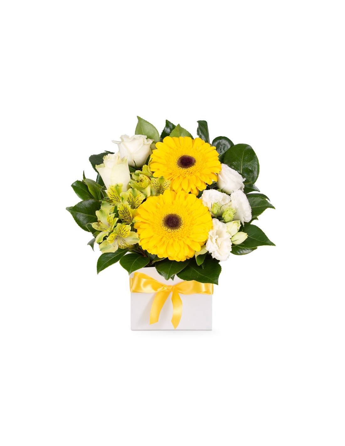 Lovely and cheerful bouquet in water with mixed seasonal flowers in shades of white and yellow with decorative greenery and with a special vase inside that already contains a reserve of water, no need for additional vase, delivered with matching box.