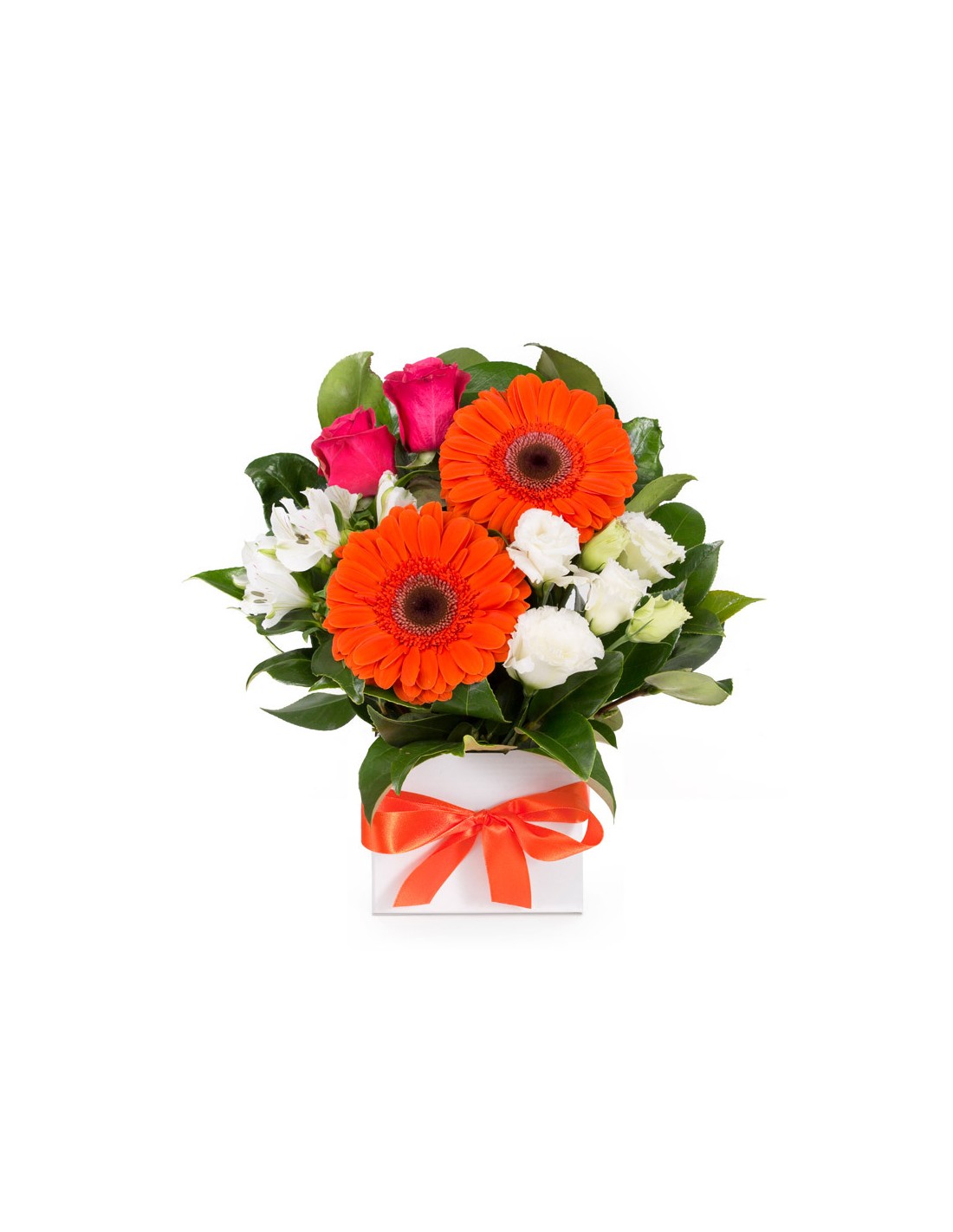 A triumph of colours and scents with this bouquet of mixed flowers in shades of white and red, embellished with decorative greenery. Its special packaging with water reserve makes it a practical and refined gift, perfect for surprising a special person on any occasion. This bouquet, approximately 40 cm high, is special because the integrated water reserve keeps the flowers hydrated for days, prolonging their beauty and fragrance. The combination of white and red creates a romantic and refined atmosphere, perfect for any occasion. There is no need for a vase, the bouquet is ready to be displayed and admired.