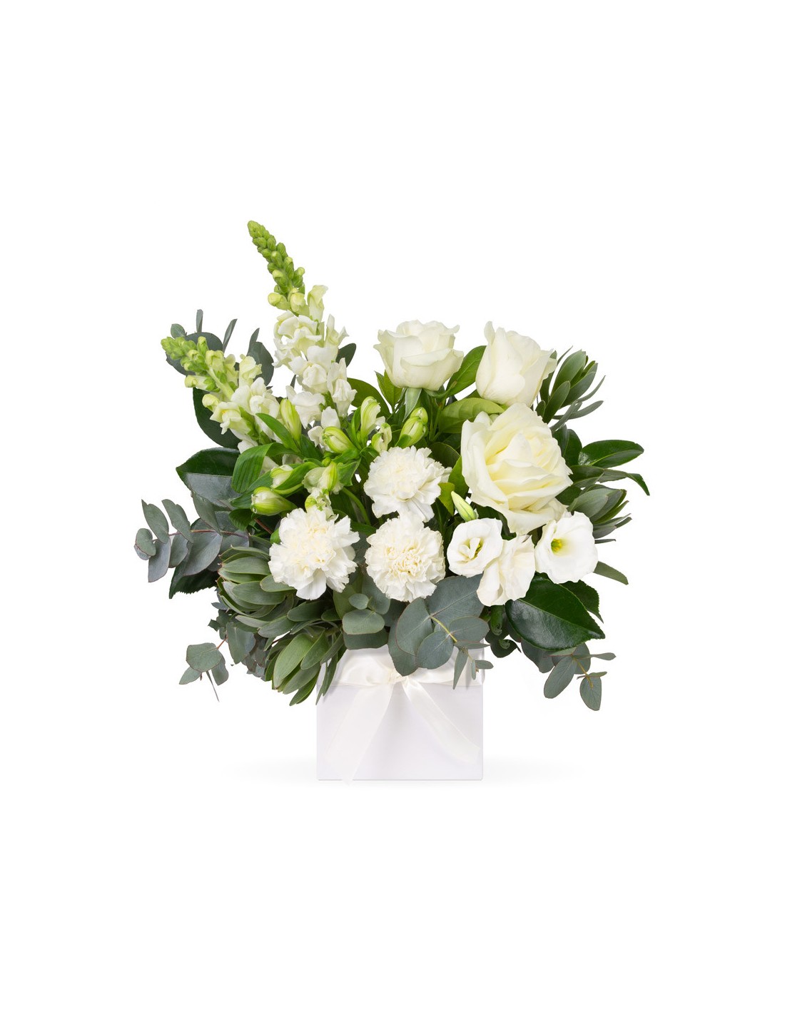 Candid and delicate bouquet in water with mixed seasonal flowers in white tones with decorative greenery and with a special vase inside that already contains a reserve of water, no need for additional vase, delivered with matching box.
