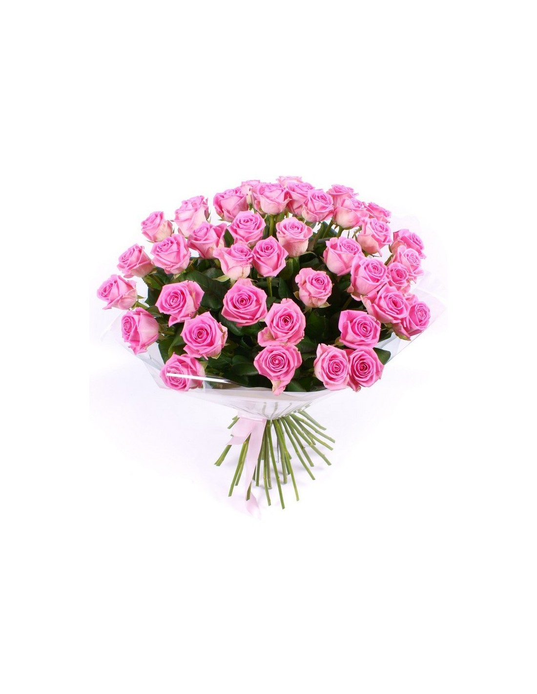Delicious bouquet with 24 medium stem pink roses (about 50 cm long) packed with decorative greenery and matching paper or fabric