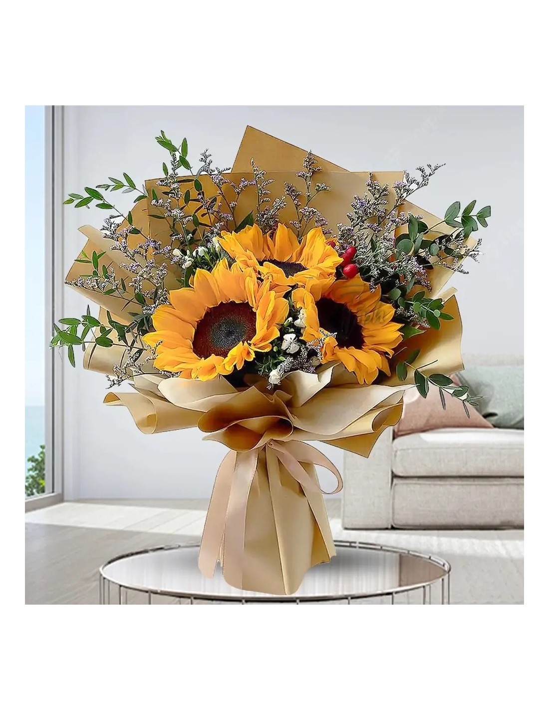 Joyful bouquet with three sunflowers packed with decorative greenery and matching paper or fabric