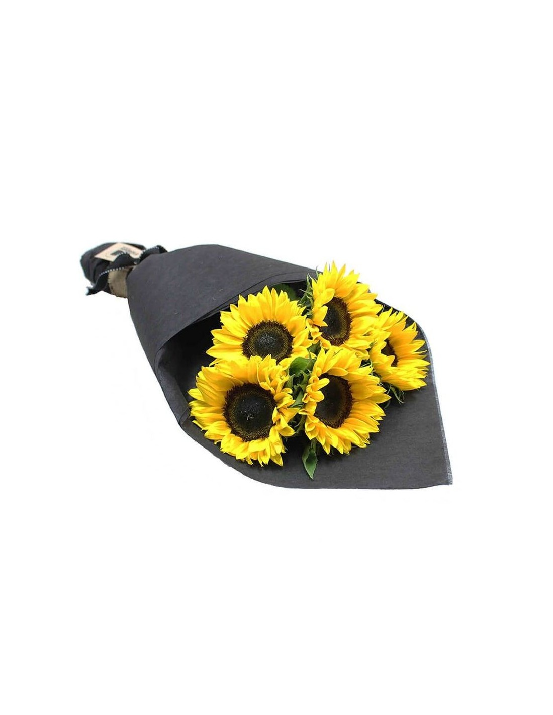 Simple and minimal bouquet with 5 medium stem sunflowers (about 50 cm long) packed without decorative greenery and matching paper or fabric