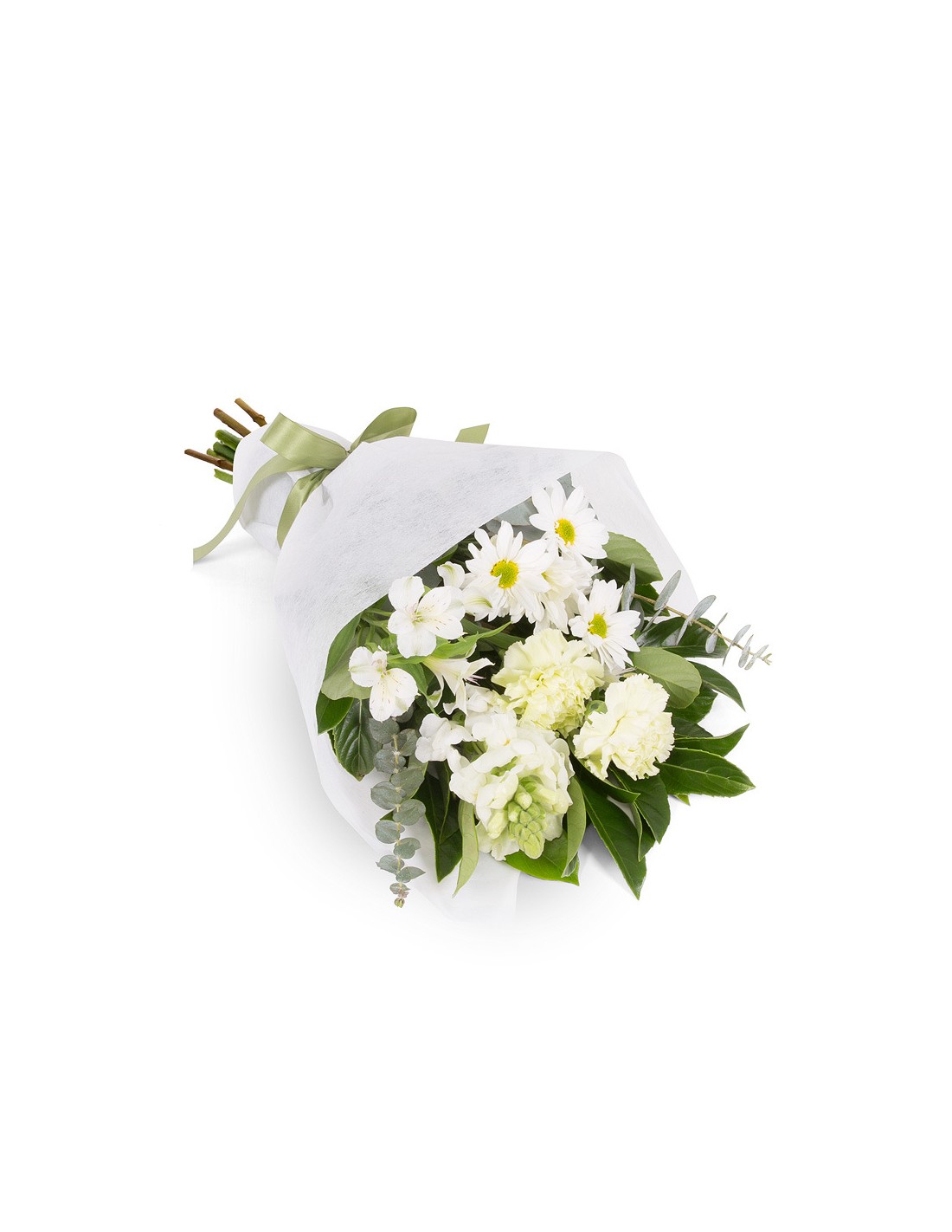 Pure and elegant funeral bouquet with mixed white seasonal flowers with decorative greenery and white fabric matched with a matching satin ribbon.