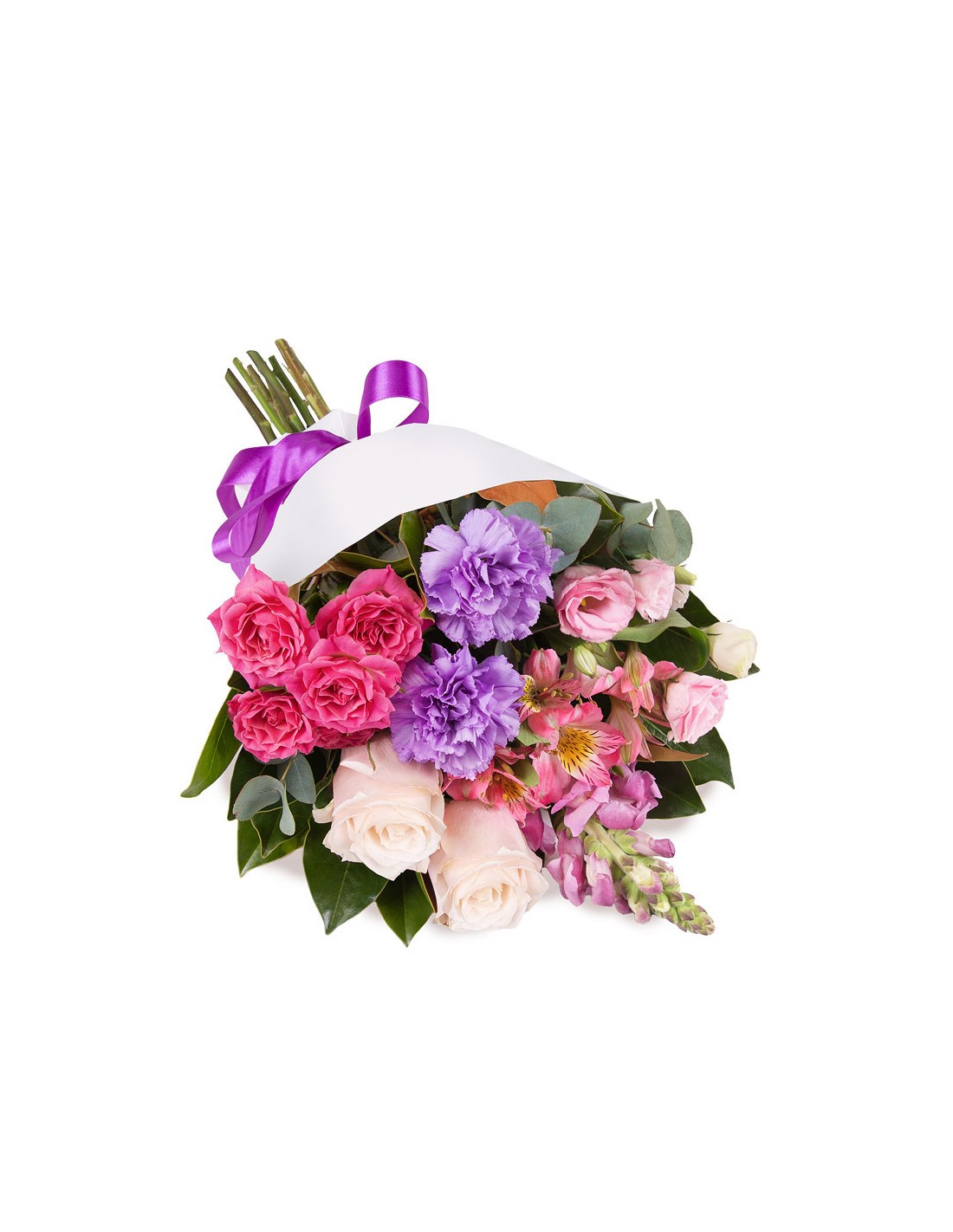 An elegant funeral bouquet composed of a selection of mixed seasonal flowers in delicate shades of pink and purple, carefully packaged with decorative greenery. A sober and refined tribute to express heartfelt condolences and convey an unmistakable message of affection and remembrance. Pink represents compassion, gentleness and remembrance. A soft colour that instils serenity and peace. Purple: Purple symbolises spirituality, eternity and remembrance. A colour that conveys deep respect and devotion.