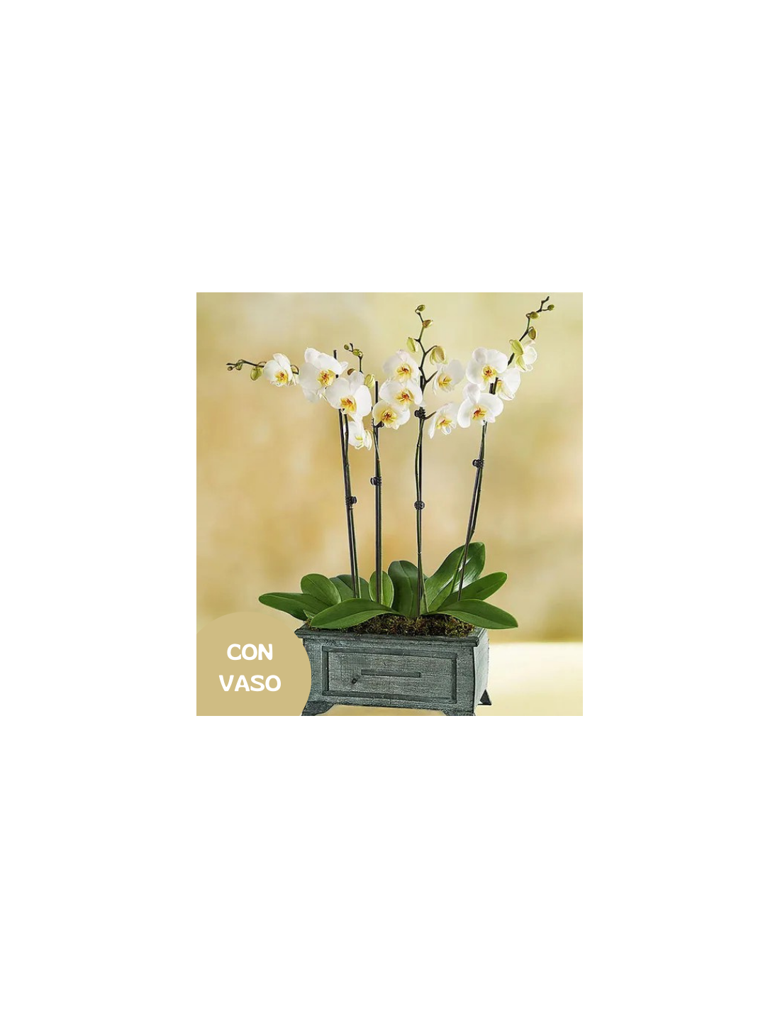Floral elegance: two white two-branched orchids, the timeless beauty of white orchids. This exquisite arrangement features two white two-branched orchids, about 60 cm high, elegantly arranged within an elegant vase made of wood, rattan, resin or ceramic, depending on availability.  A perfect gift to celebrate any special occasion, from anniversaries to simple displays of affection. White orchids symbolise purity, refinement and eternal beauty, bringing a touch of class to any setting.