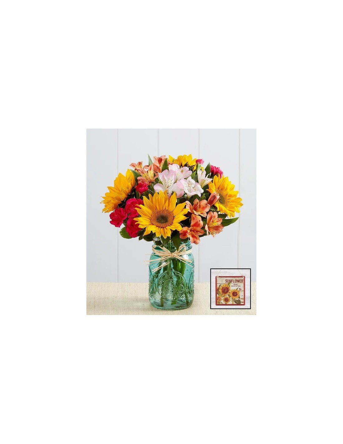 Porta il sole in casa con un sorriso radioso! Questo vivace bouquet di girasoli e fiori di stagione, circa 50 cm di lunghezza, inonderà di gioia la tua casa o quella di una persona speciale. I girasoli, simbolo di felicità e allegria, si accompagnano a una selezione di fiori freschi di stagione, creando una composizione unica e vibrante. Il verde decorativo completa l'armonia del bouquet, donandogli un tocco di naturalezza ed eleganza. Fiori di stagione: la selezione precisa dei fiori può variare a seconda della disponibilità del momento, garantendo sempre un risultato fresco, colorato e di alta qualità.