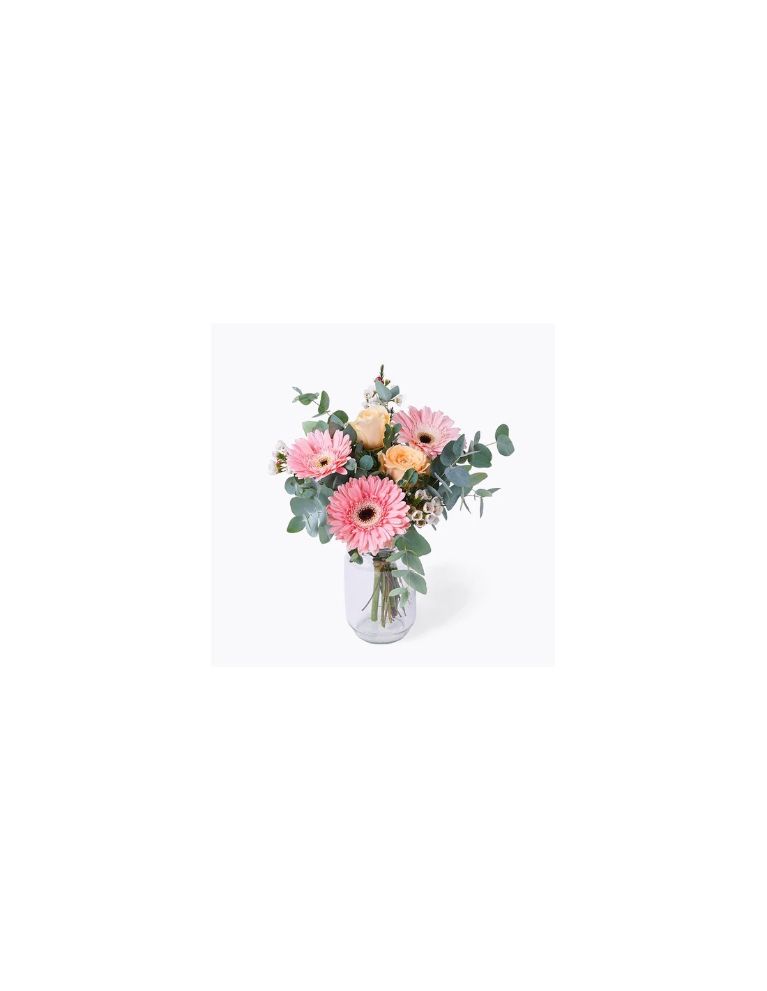 Un trionfo di colori pastello avvolge i tuoi sensi con questo bouquet, circa 50 cm di lunghezza, una composizione romantica e raffinata che celebra la bellezza delicata delle rose e gerbere. Tonalità di rosa si intrecciano armoniosamente, creando un'atmosfera di dolcezza e femminilità. Le gerbere, con i loro petali allegri e vibranti, donano un tocco di gioia e positività, mentre le rose, simbolo per eccellenza dell'amore, esprimono eleganza e raffinatezza. Completato da verde decorativo, questo bouquet è perfetto per esprimere i tuoi sentimenti più sinceri in ogni occasione.