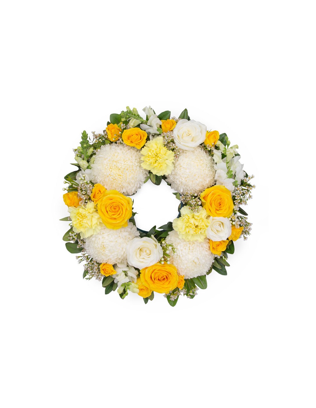 Elegante e sobria coroncina funebre con fiori misti di stagione sui toni del bianco e giallo del diametro di circa 50 cm con verde decorativo, consegnata senza supporto perché realizzata per essere adagiata a terra