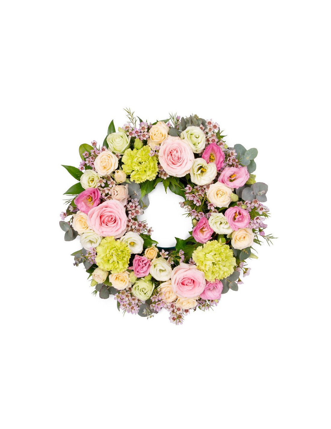 Un tributo d'amore realizzato con fiori di stagione bianchi e rosa, delicatamente incorniciati da verde decorativo. Questa coroncina funebre , diametro circa 50 cm, esprime eleganza, purezza e affetto profondo, donando un tocco di solenne bellezza all'ultimo saluto a una persona cara. Fiori freschi e accuratamente selezionati per garantire un omaggio duraturo nel tempo e ricco di significato. Un dono prezioso per esprimere le tue più sentite condoglianze e offrire un conforto silenzioso ai tuoi cari in questo momento di profondo dolore.