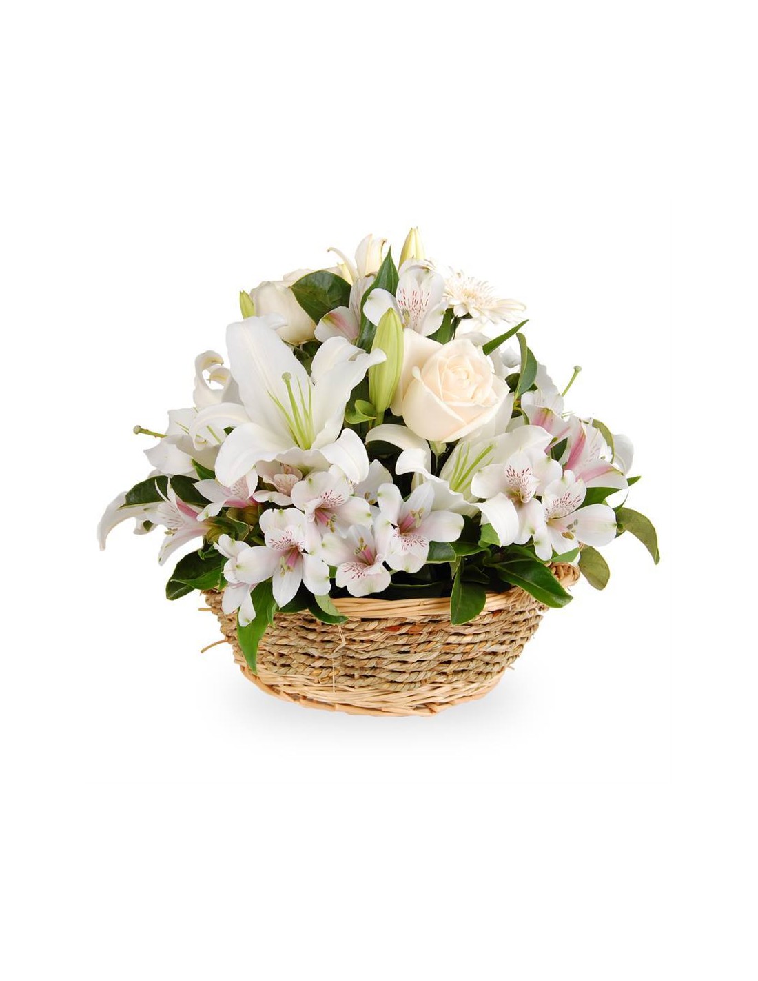 Un tributo di eleganza e purezza per esprimere le tue più sentite condoglianze. Questo cesto funebre, diametro di circa 25 cm e altezza circa 60 cm, è composto da una selezione di fiori bianchi di stagione accuratamente disposti e impreziositi da verde decorativo. Simbolo di pace e rispetto, il bianco evoca un ricordo luminoso della persona cara scomparsa. La varietà di fiori, sapientemente accostati, dona a questo omaggio un aspetto armonioso e raffinato. Un gesto di partecipazione profonda e sincera per accompagnare i tuoi cari in questo momento di dolore.