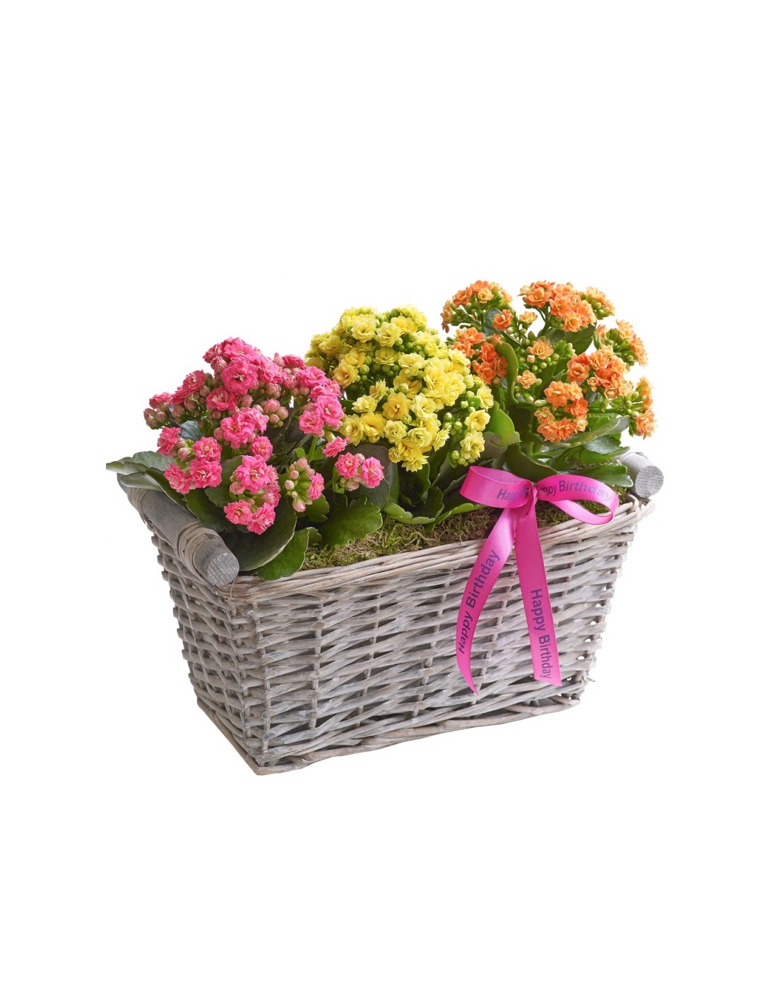 Allegro e simpatico giardinetto di rattan che contiene piante di Kalanchoe dai colori misti e assortiti