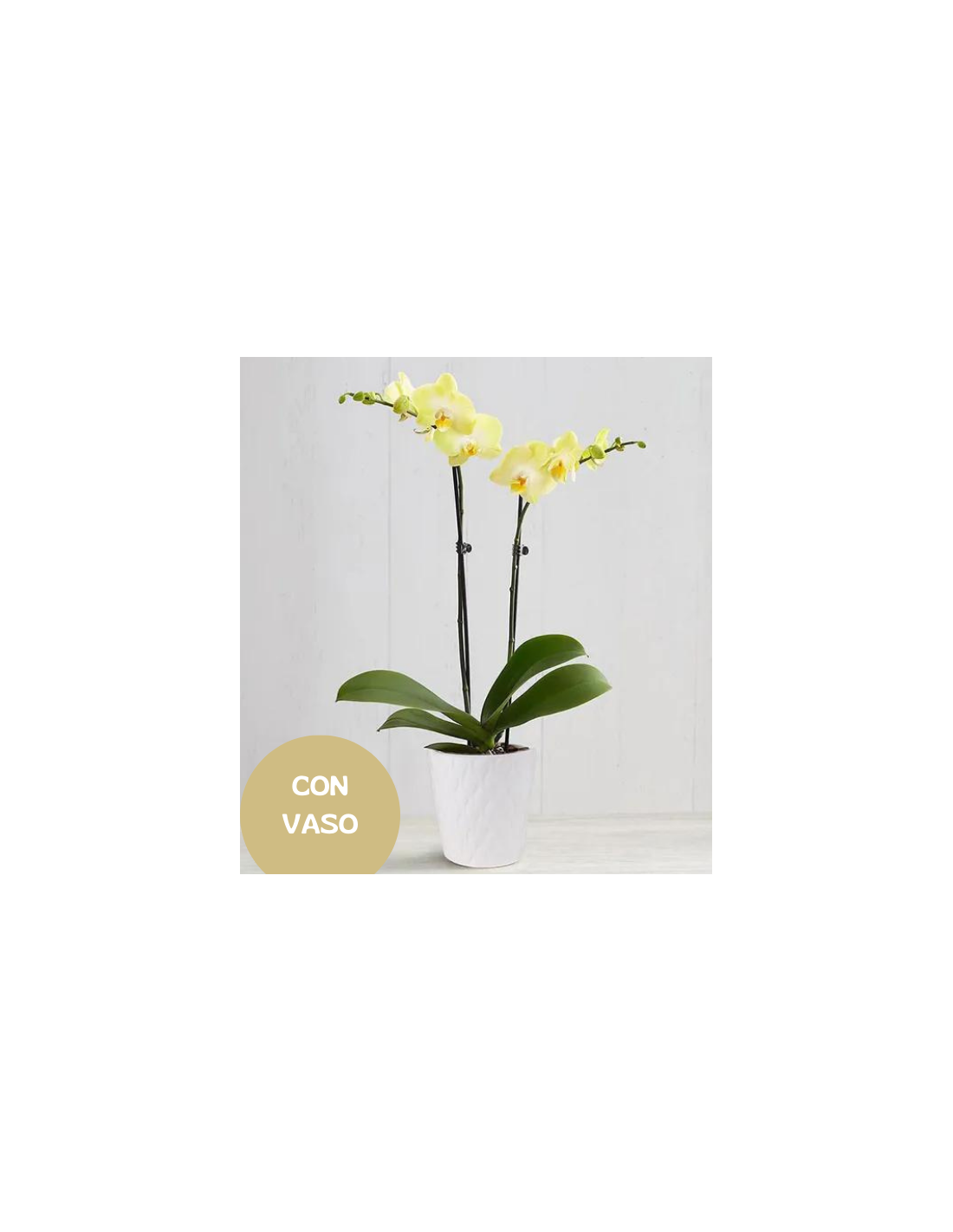 Elegante e colorata pianta di orchidea Phalenopsis due rami gialla, altezza circa 60 cm e diametro 12 cm confezionata con carta o tessuto in tono, acquistabile a parte il vaso in ceramica.