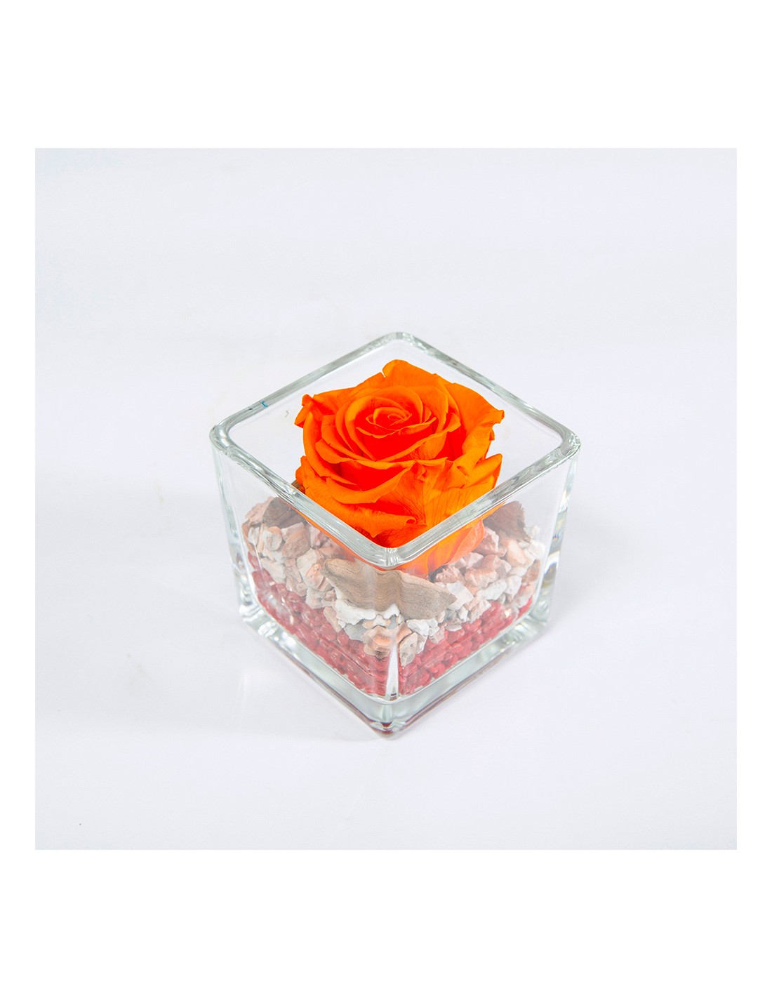 La nostra bellissima rosa stabilizzata arancio è contenuta all'interno di un vaso di vetro quadrato delle dimensioni di 8 cm x 8 cm e durerà per anni all'interno delle vostre case, rendendo questo regalo speciale e memorabile per molto tempo.